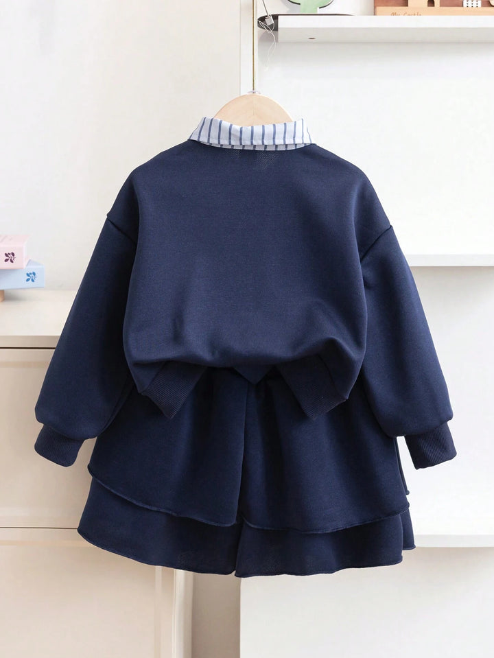 Young Girl 2 In 1 Outfit With Shirt Collar Sweatshirt And Layered Skirt