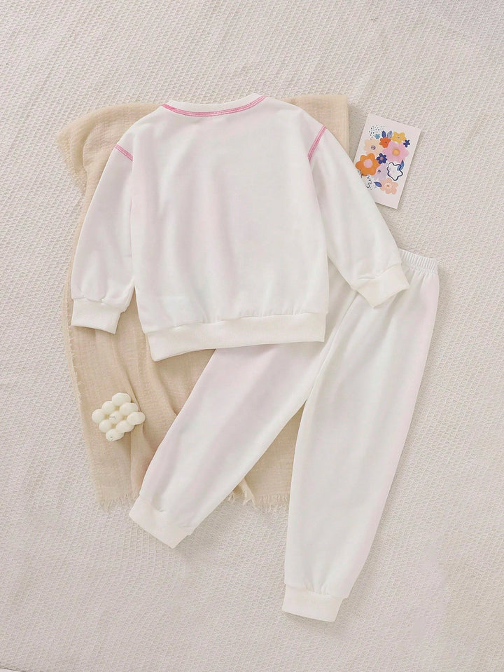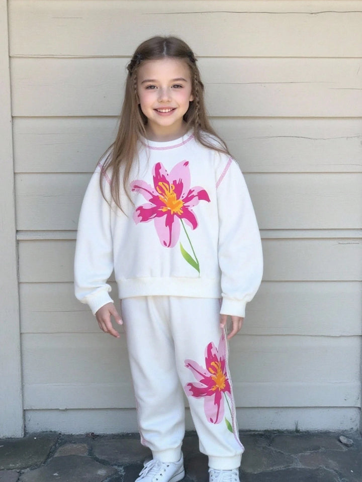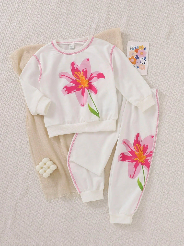 Young Girl Casual Basic Style Floral Print Front Panel, Ribbed Collar, Cuffs And Hem Contrast Color Long Sleeve Top And Pants