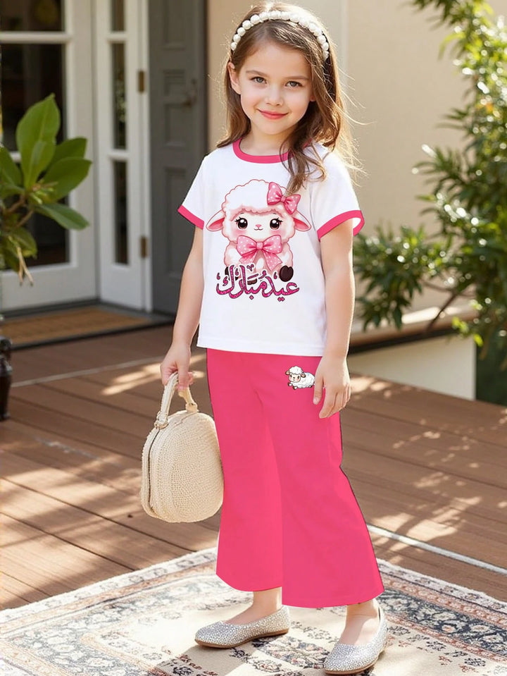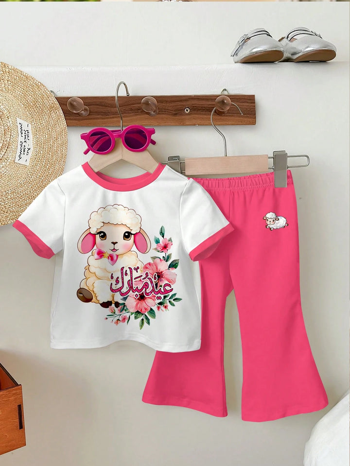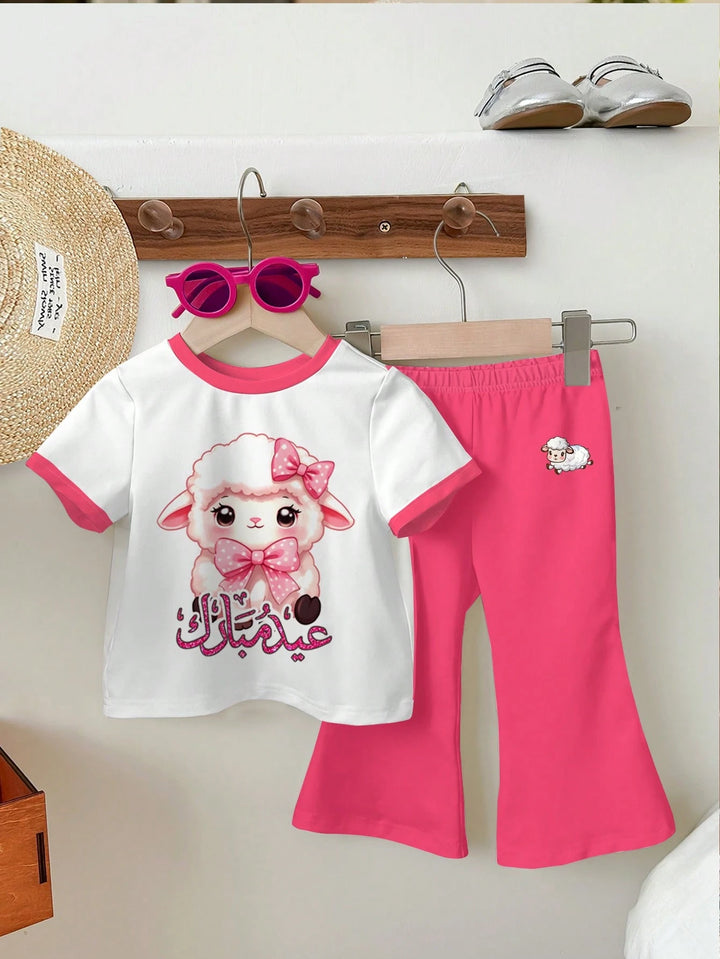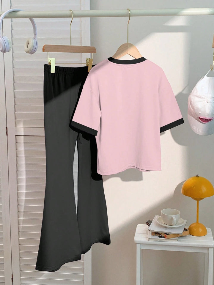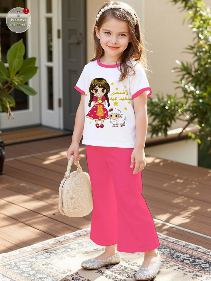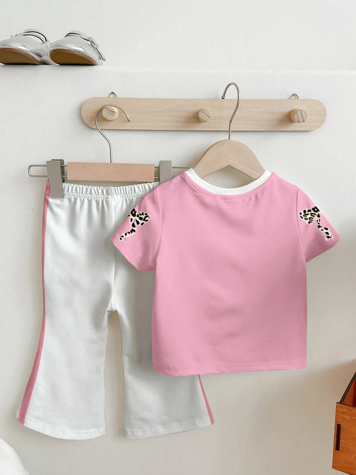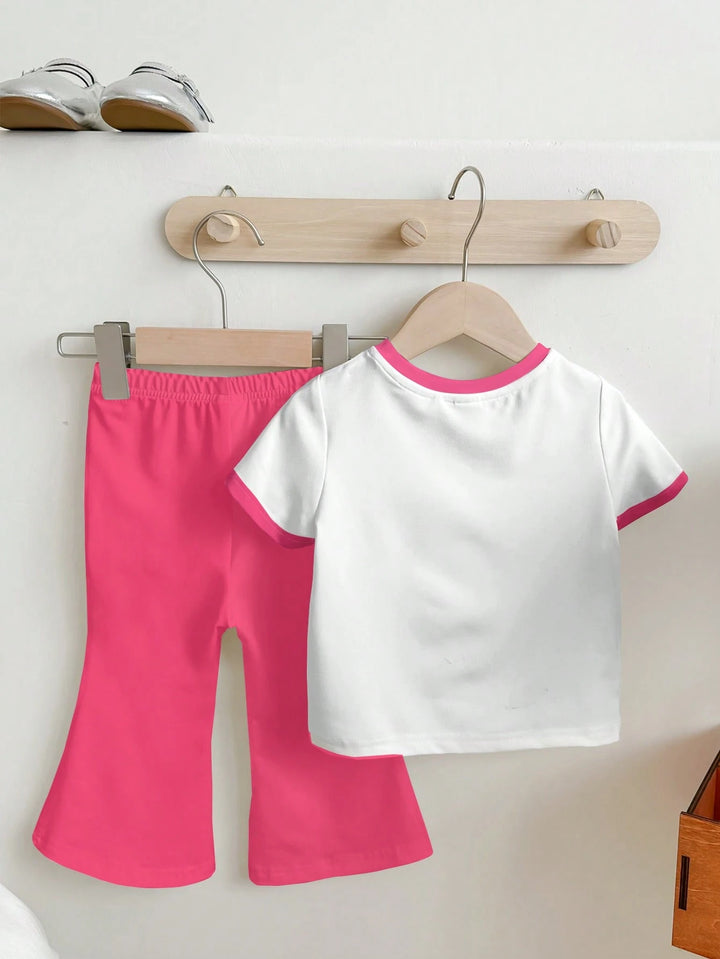 Young Girl Casual Cartoon Pattern Crew Neck Short Sleeve Top & Flare Pants