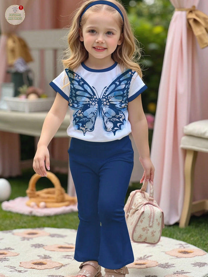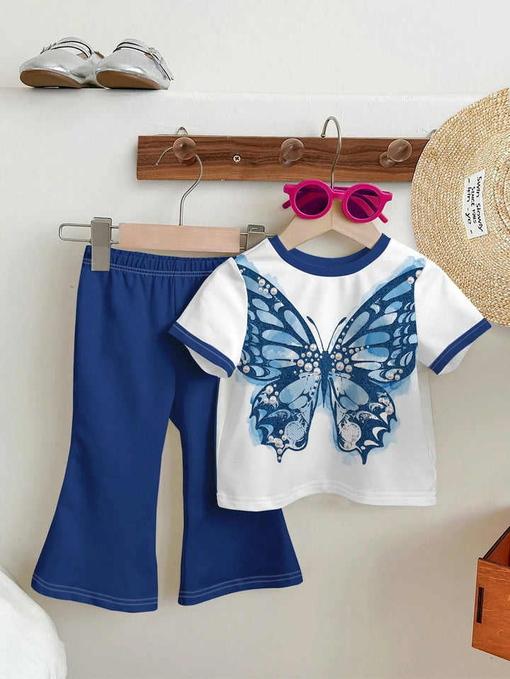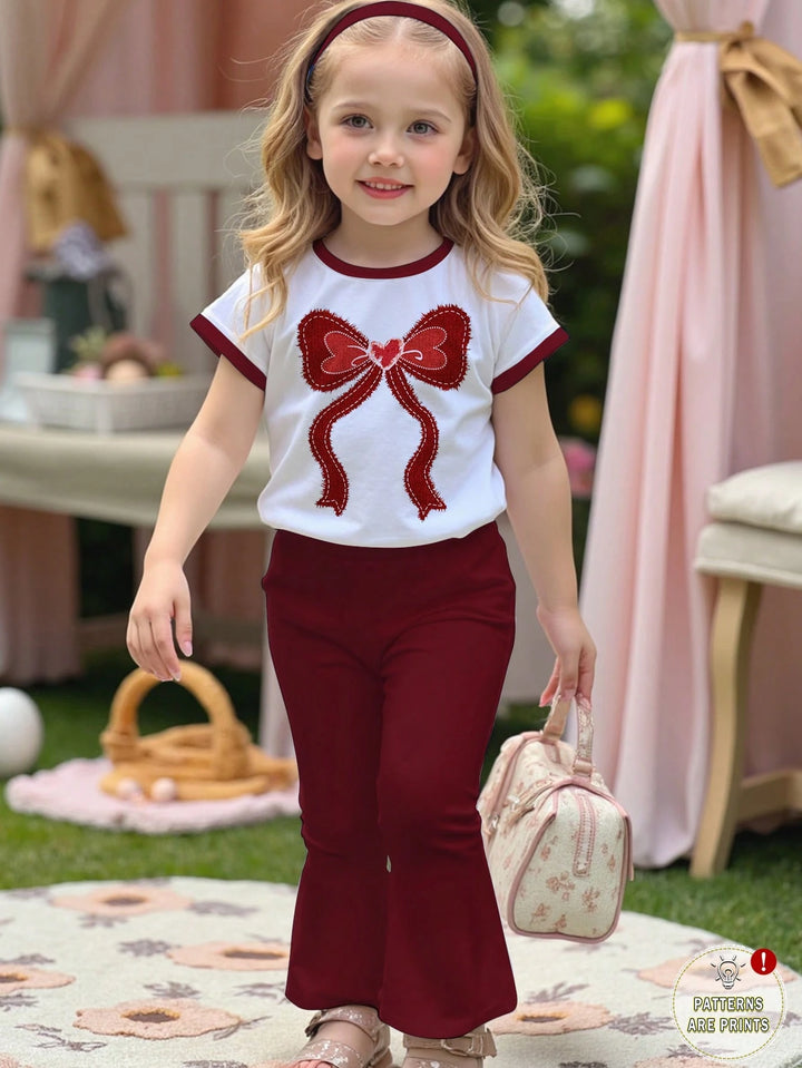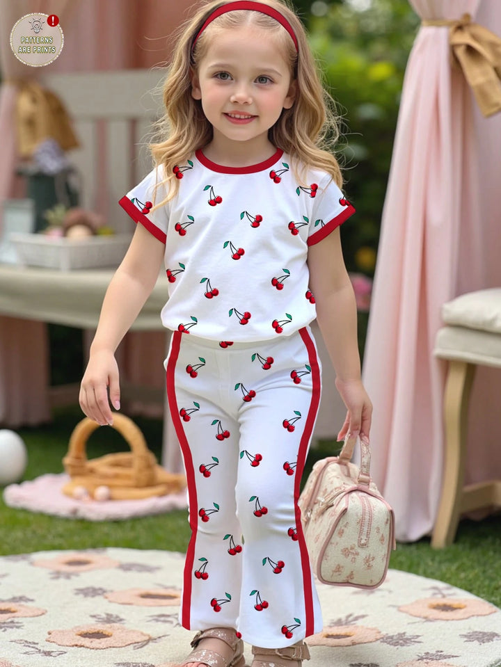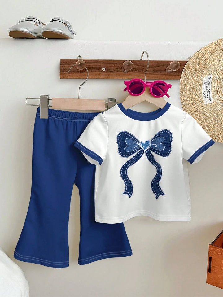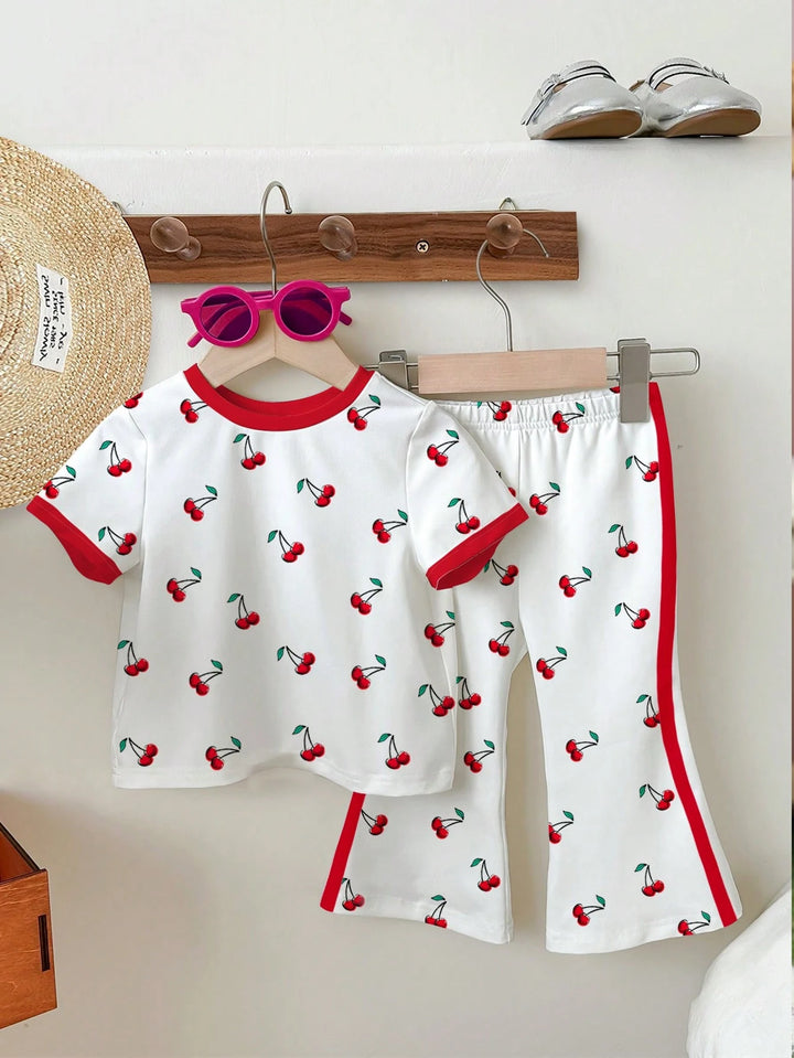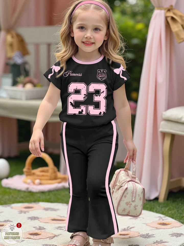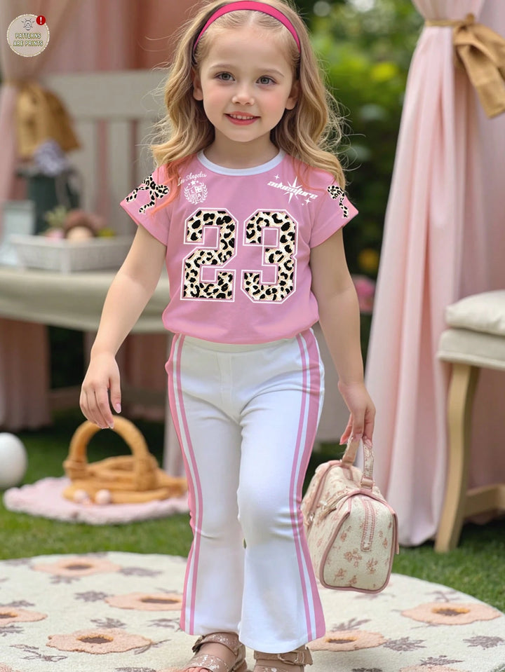 Young Girl Casual Cartoon Pattern Crew Neck Short Sleeve Top & Flare Pants