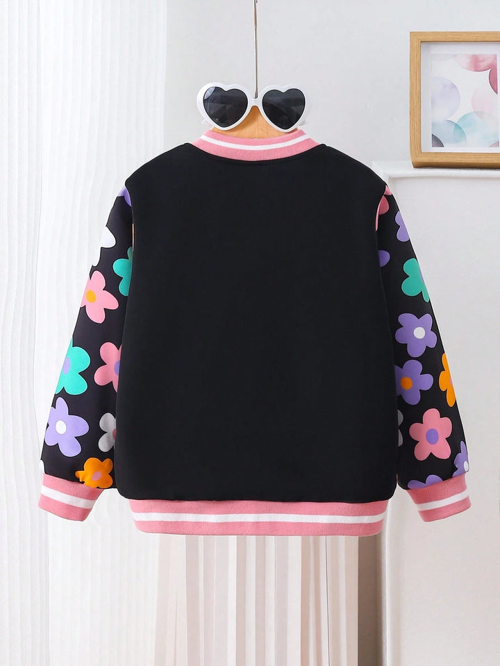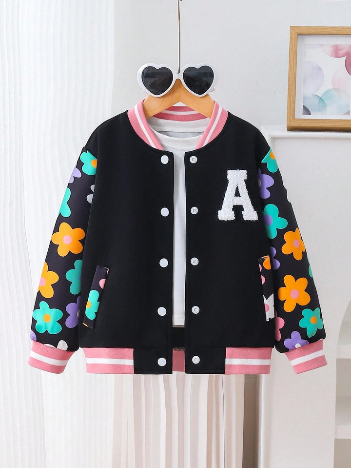 Young Girl Cute Floral Sleeve Print Towel Embroidered Patch Bomber Jacket