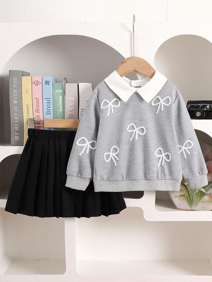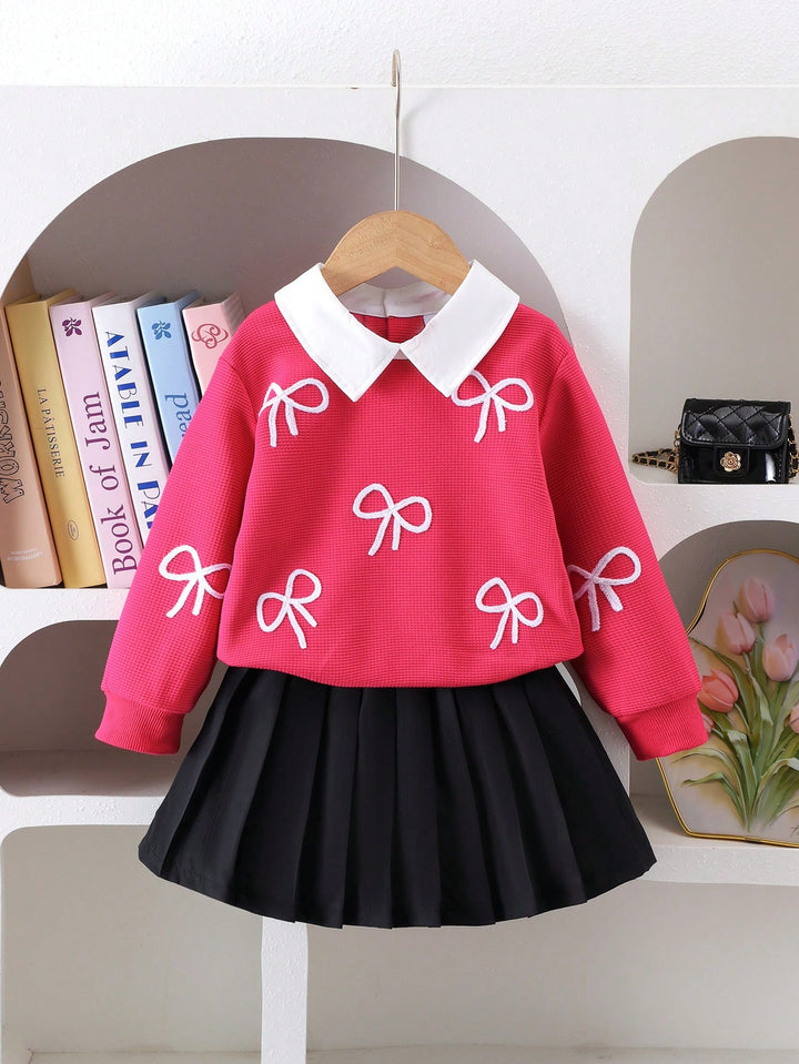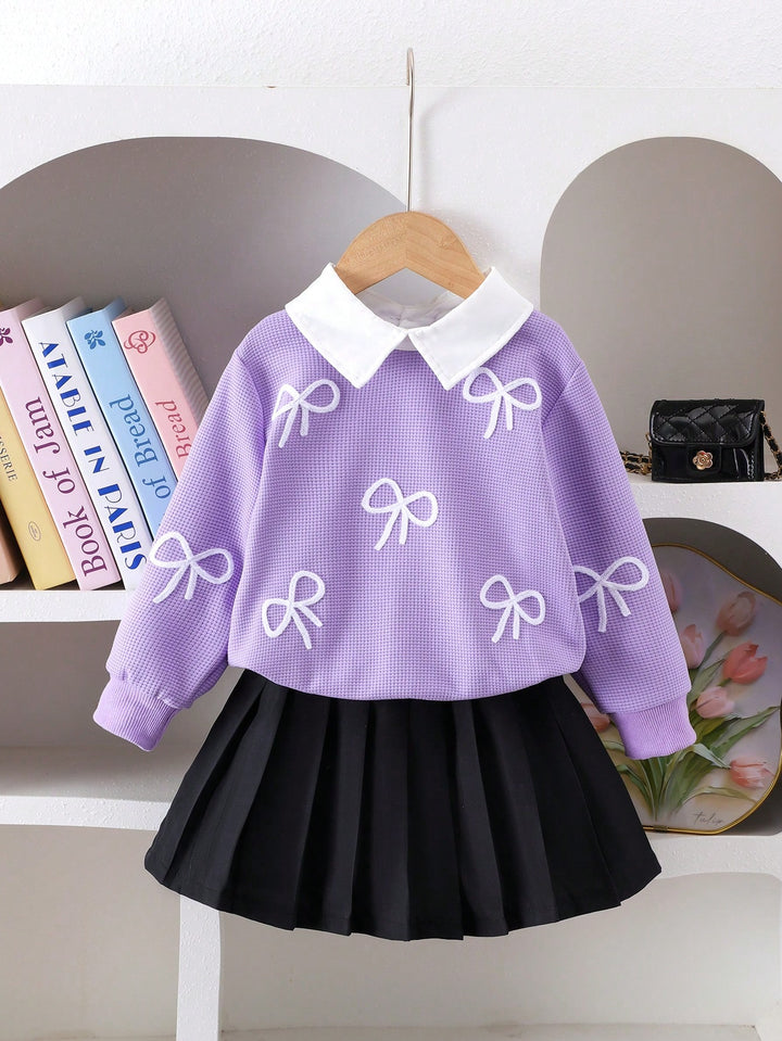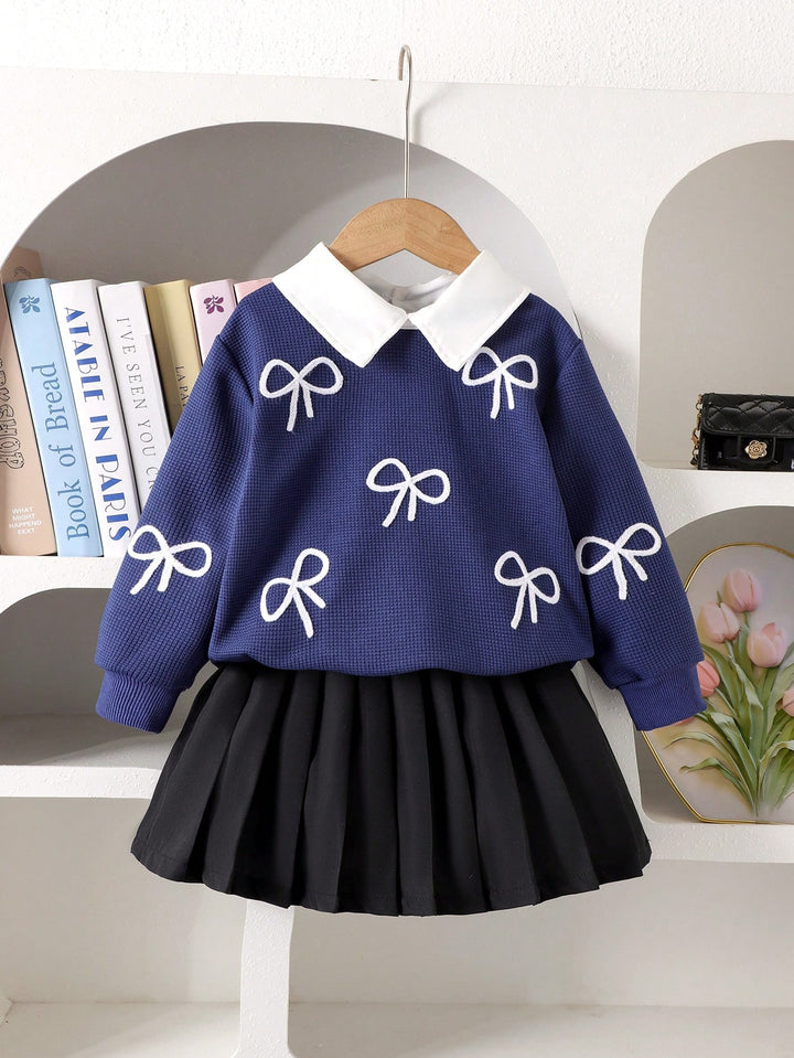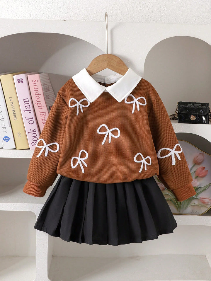 Young Girl Fashion Bow Embroidery Collar Long Sleeve Top And Pleated Skirt Set
