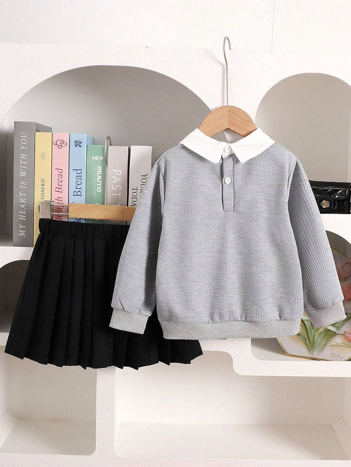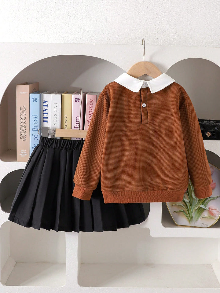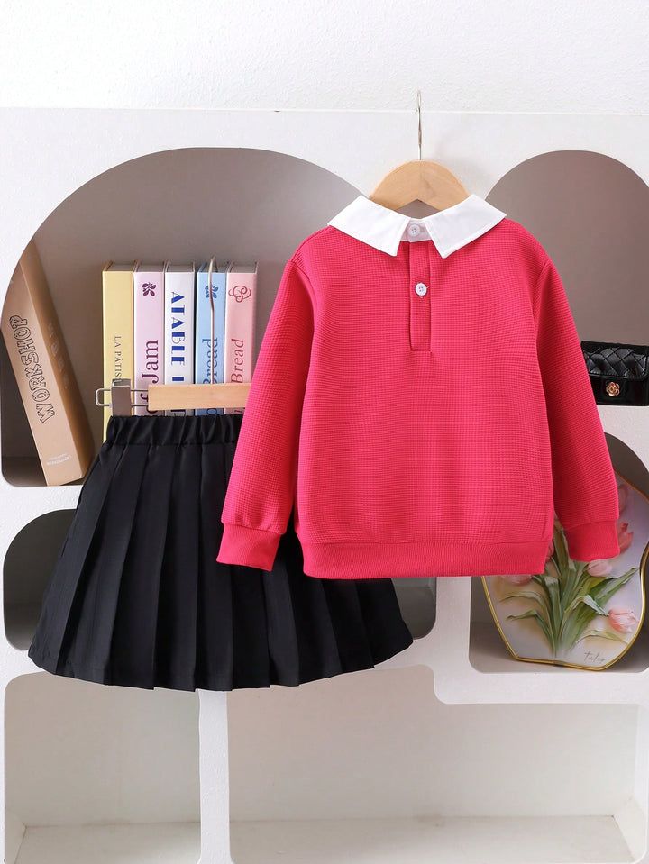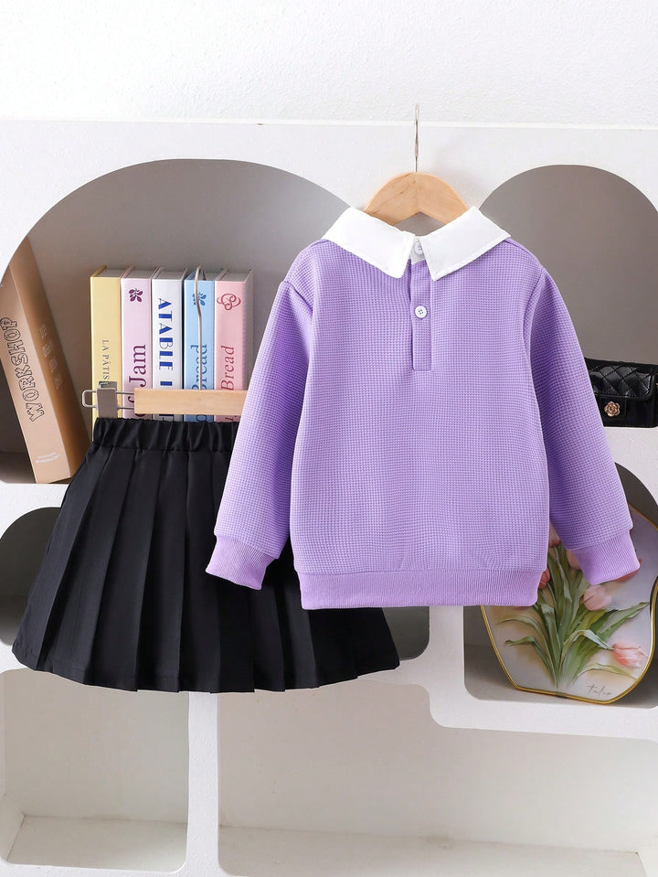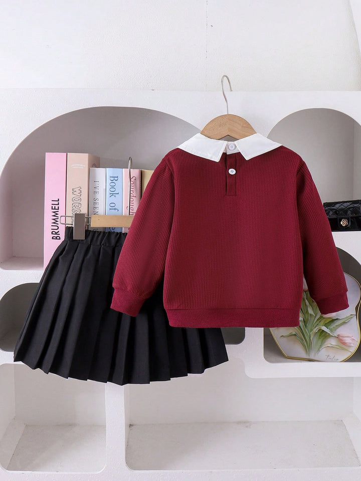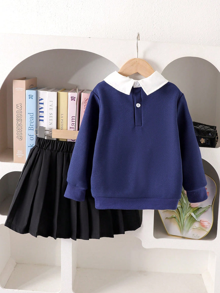 Young Girl Fashion Bow Embroidery Collar Long Sleeve Top And Pleated Skirt Set