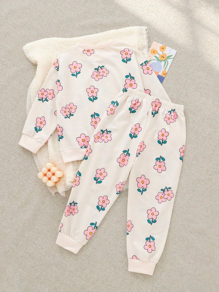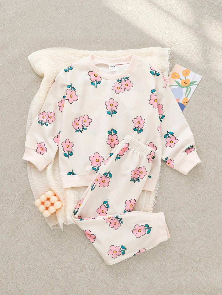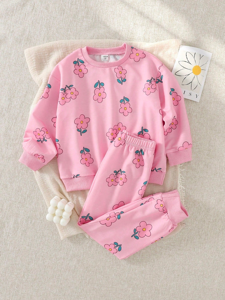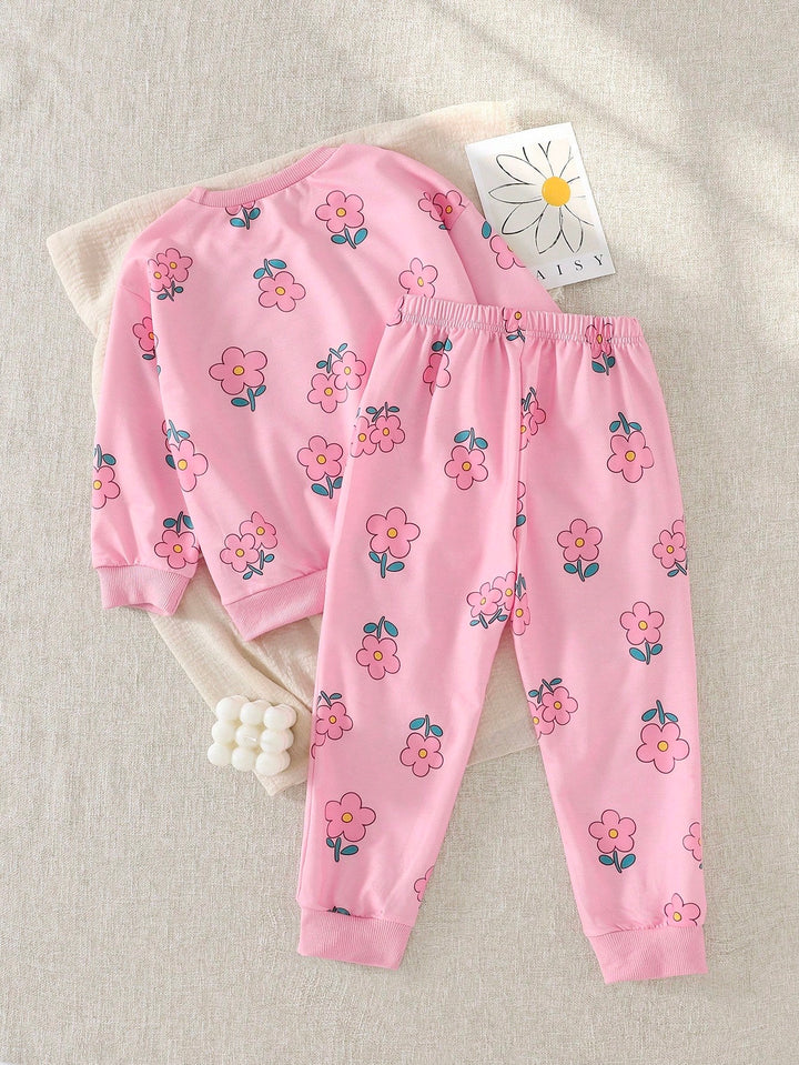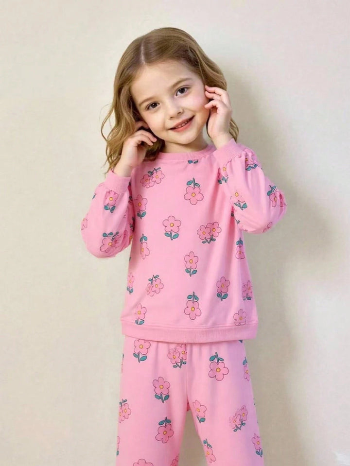 Young Girl Floral Print Crew Neck Long Sleeve Sweatshirt Top & Floral Pants