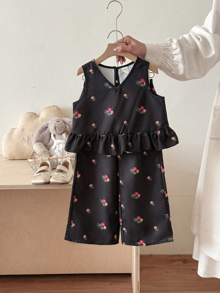 Young Girl Floral Woven V-Neck Sleeveless Ruffle Hem Blouse Top And Loose Casual Woven Wide-Leg Floral Long Pants