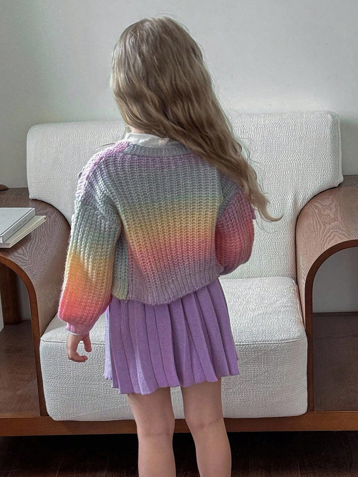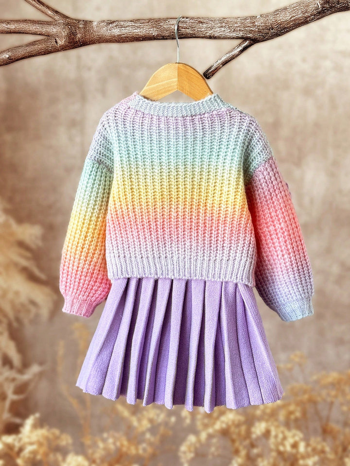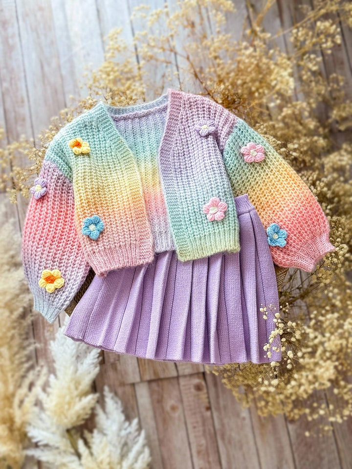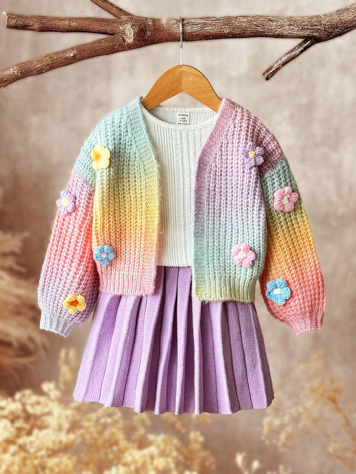 Young Girl Frenchy Sweet Cute 3D Floral Tie-Dye Knitted Cardigan & Pleated Skirt