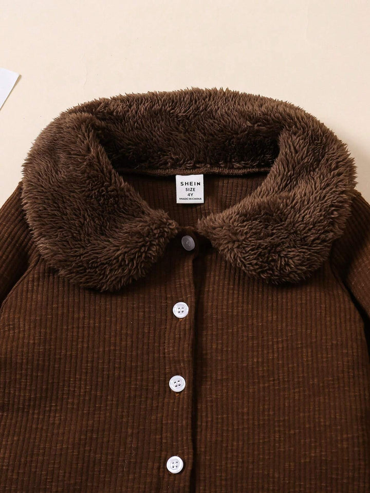 Young Girl Furry Lapel & Cuffs Patchwork Jacket Top And Flare Legs Furry Patchwork Pants
