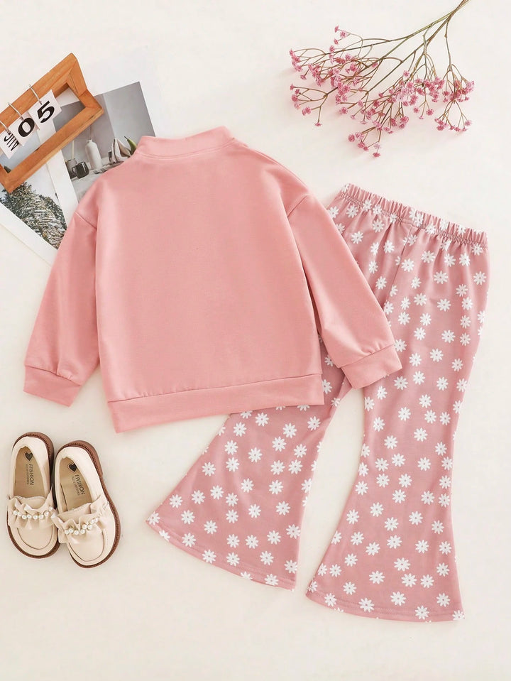 Young Girl Pink Drop Shoulder Daisy Print Half-Zip Hoodie And Daisy Print Flare Pants Set