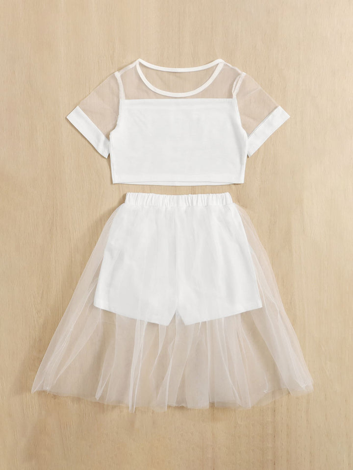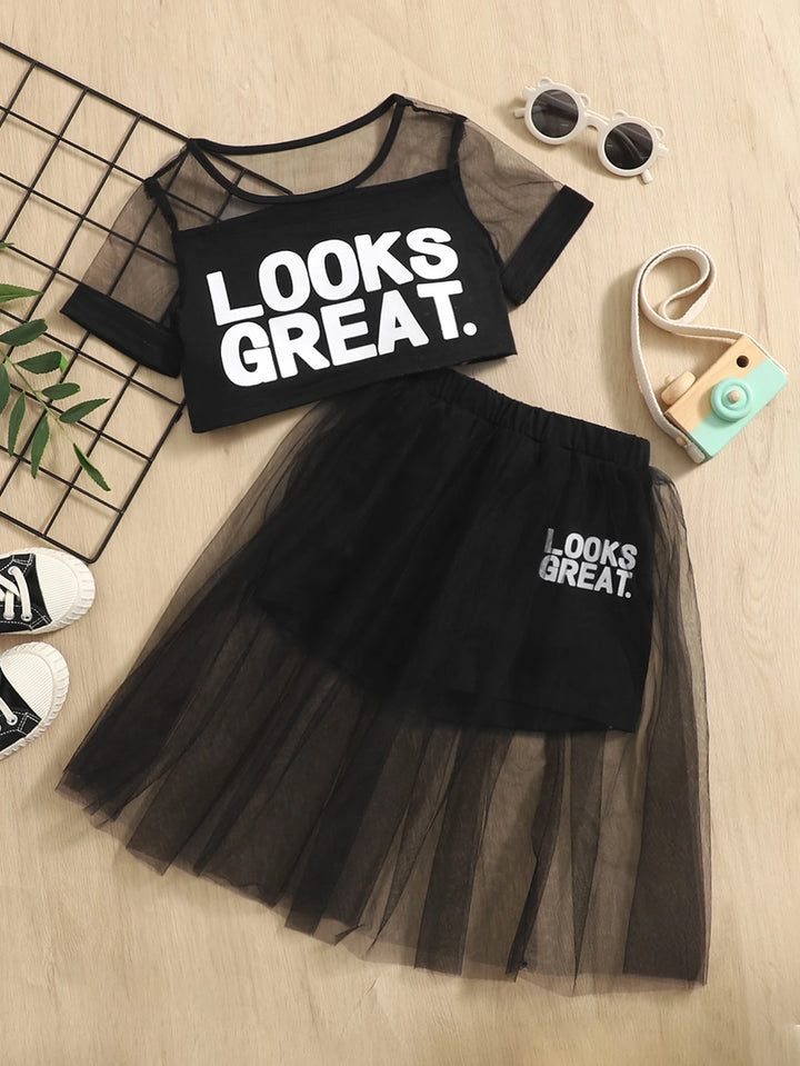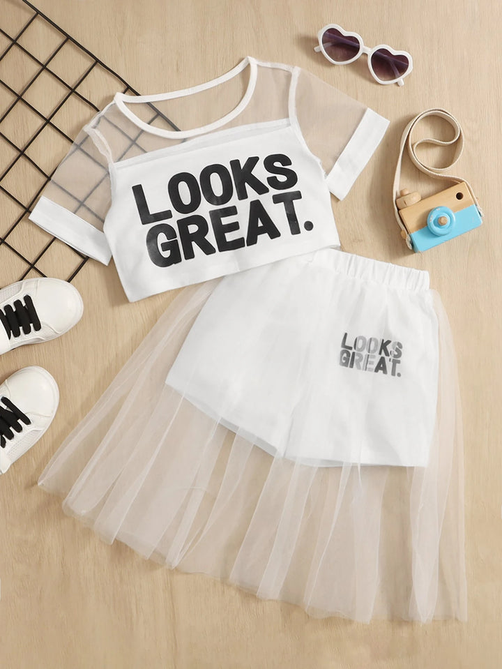 Young Girl Slogan Graphic Contrast Mesh Tee & Skort