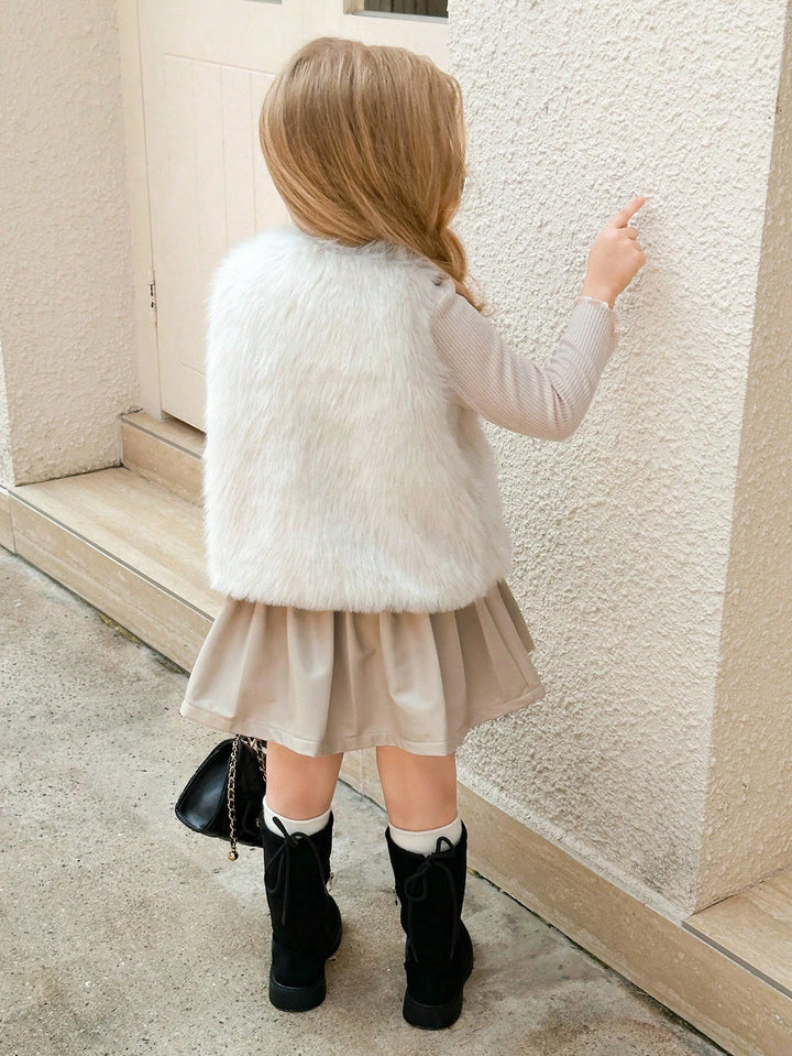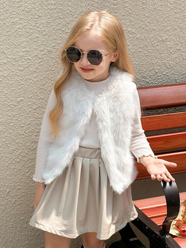 Young Girl Solid Fuzzy Vest Coat & Lettuce Trim Long Sleeve Tee & Fold Pleated Skirt