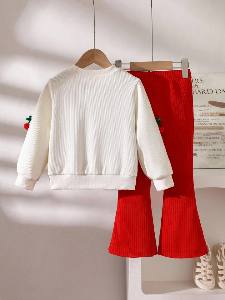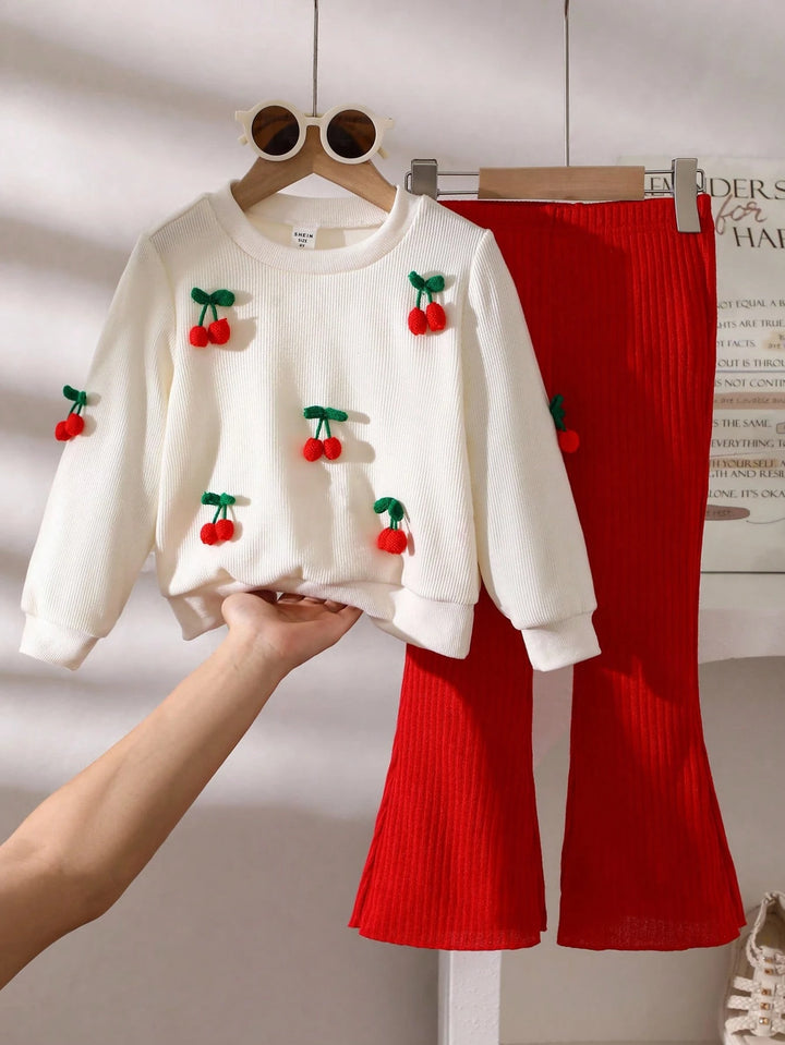 Young Girls 2pcs/Set White Long Sleeve Knit Pullover & Red Cherry Print Knit Pants