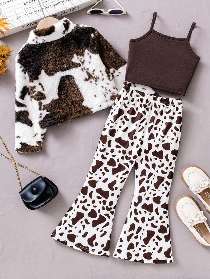 Young Girls Brown Milk Texture Short Reversible Fleece Jacket, Camisole Top And Flared Leg Casual Pants