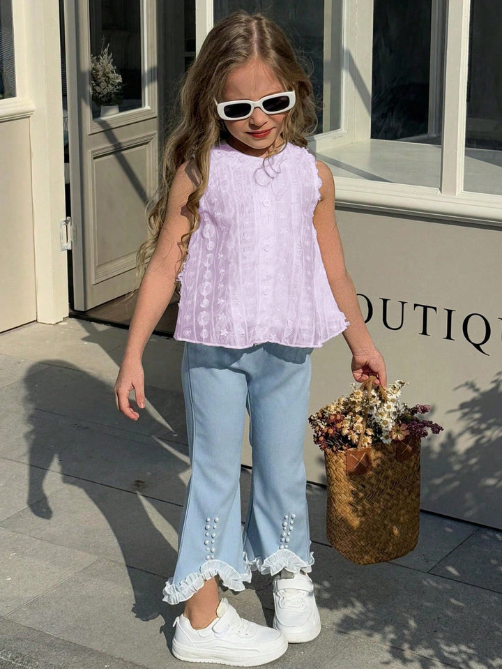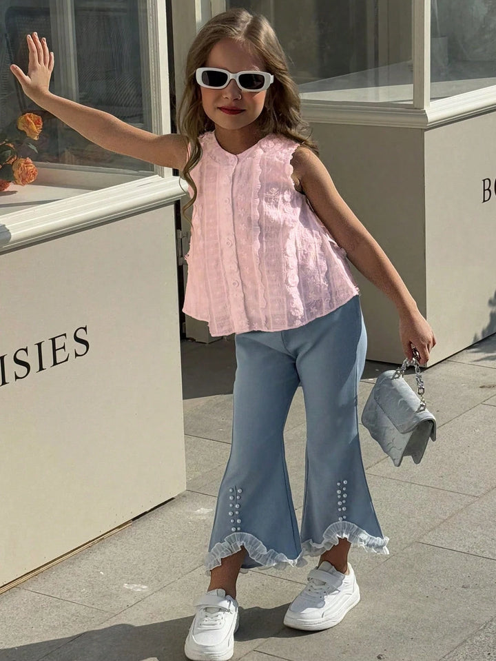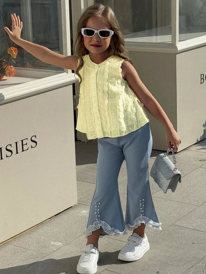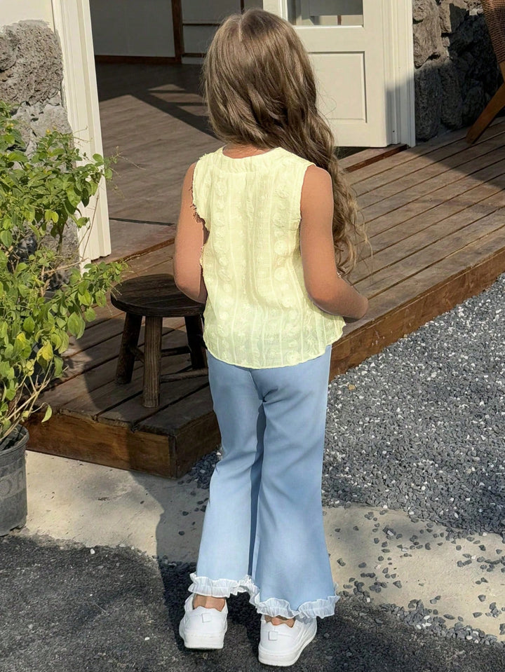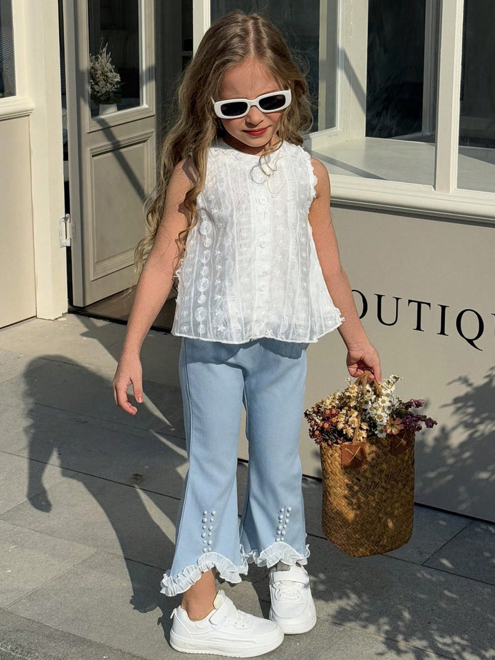 Young Girls Daily Casual White Sleeveless Knitted Top + Blue Long Pants