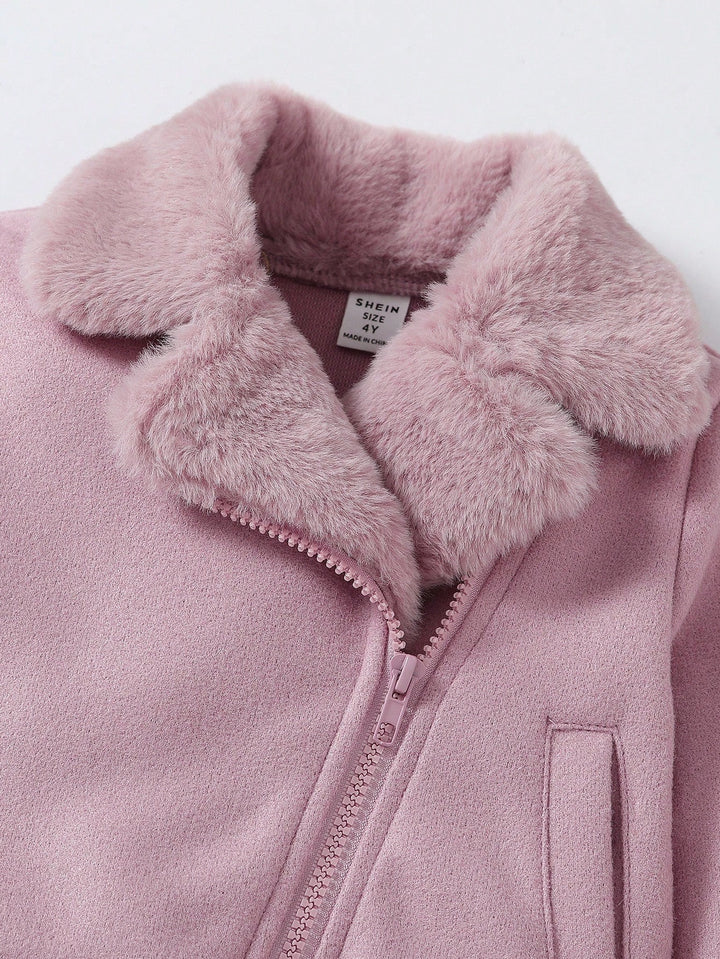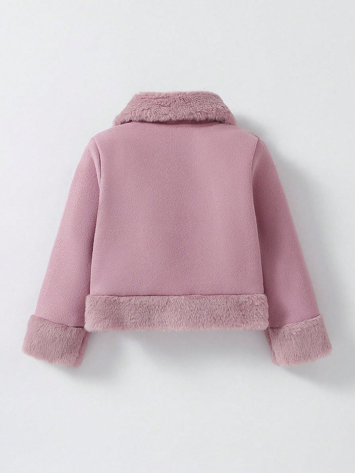 Young Girls' Solid Color Faux Fur Collar Long Sleeve Zip-Up Short Winter Jacket